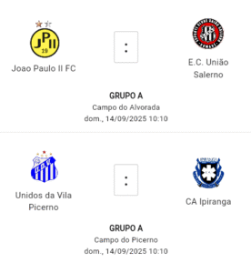 Na vice-liderança, o UDV Picerno enfrenta o Ipiranga, lanterna do grupo, também no domingo às 10h10, no Campo do Picerno. O duelo pode consolidar a equipe da casa como principal perseguidora do Fumaça.