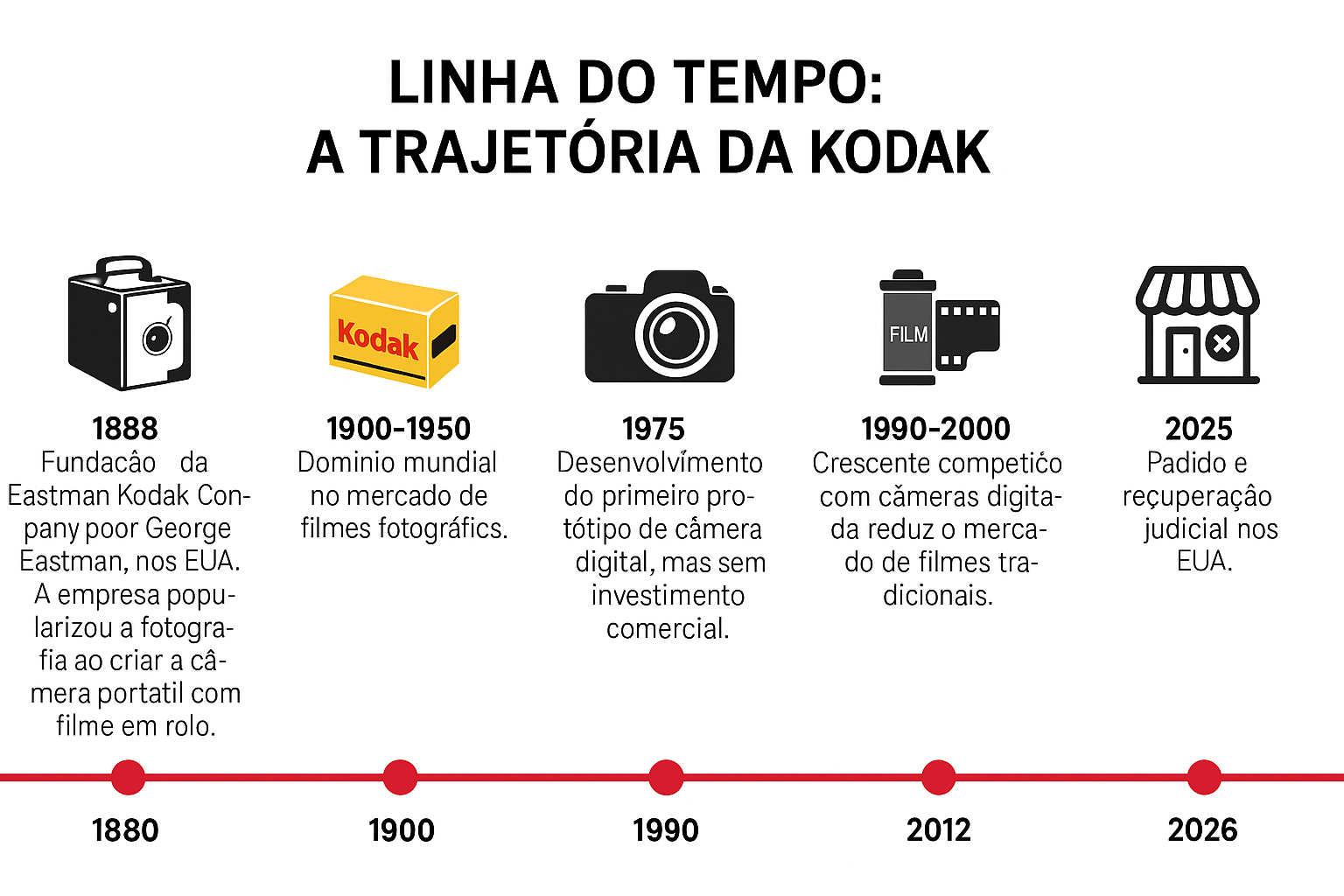 Sugestão de imagem: linha do tempo gráfica com os marcos históricos da Kodak, mostrando evolução de câmeras, filmes e digitalização.